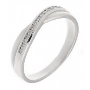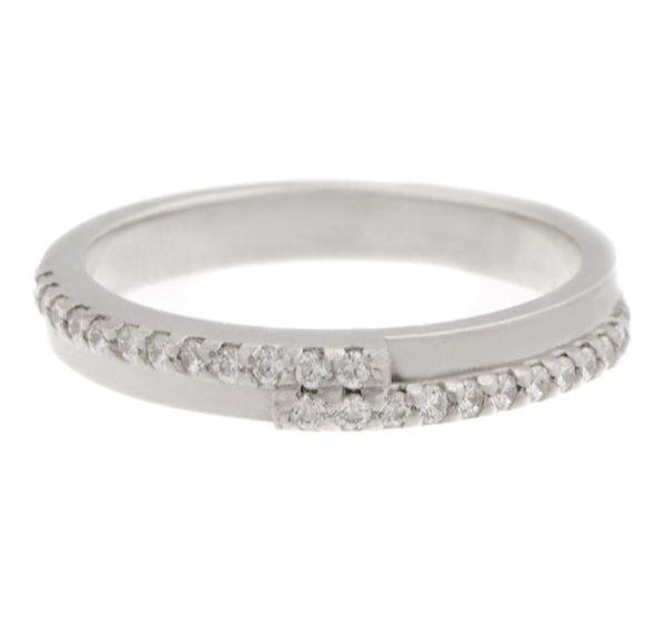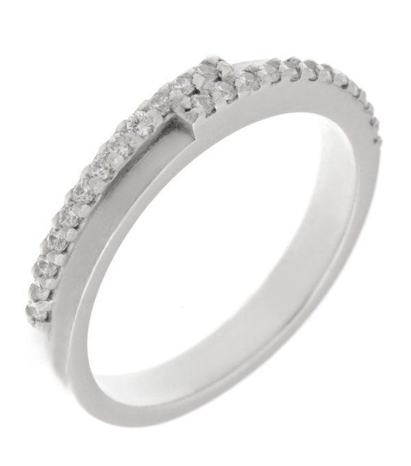 A modern round diamond eternity style ring, claw set with a crossover setting.