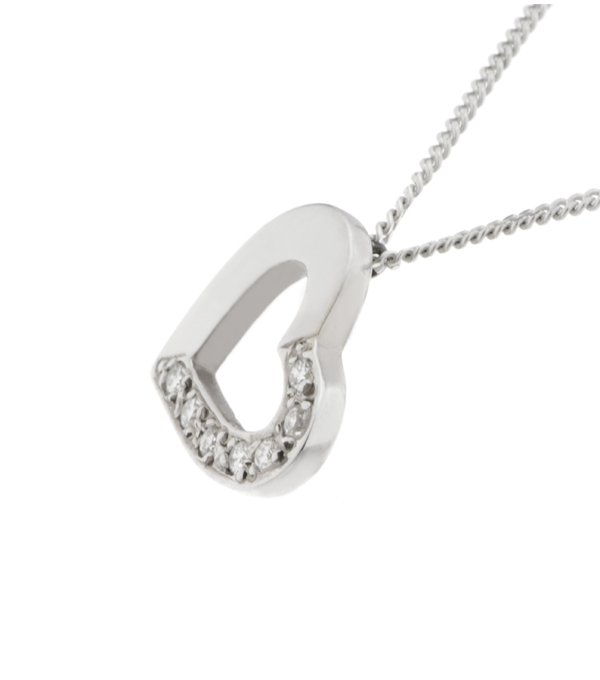 A modern heart shaped pendant with grain set diamonds half way around the heart, designed to sit at an angle when worn.