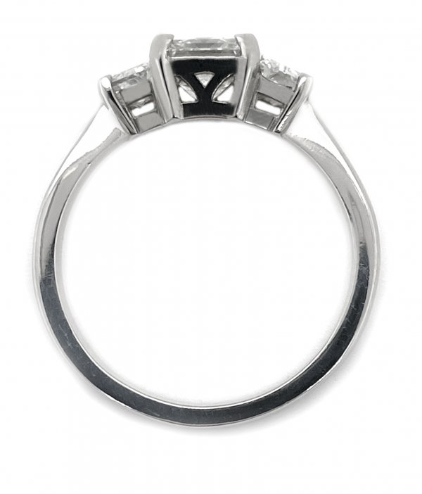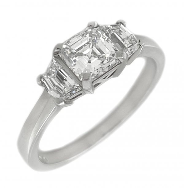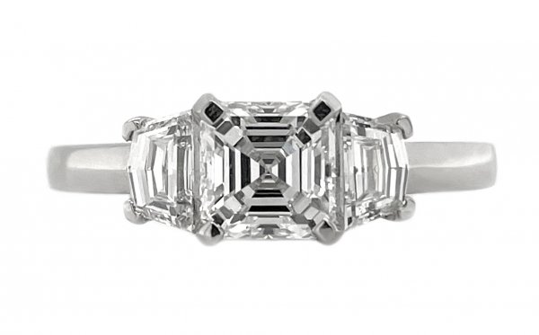 A classic 1920's Art Deco style ring with an Asscher cut or modified emerald cut Diamond centre stone with Cadillac stepped cut diamonds in the shoulders.