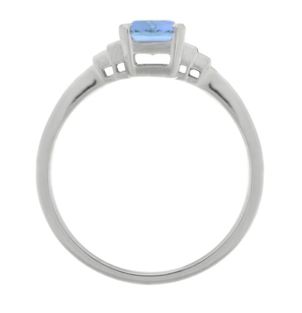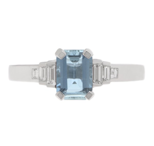 A 1920's Art Deco style ring with an octagon shaped, emerald cut aquamarine or aqua main stone and baguette cut diamond set in to the stepped shoulders.