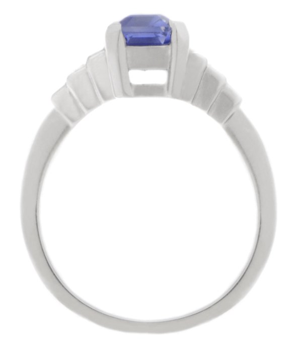 A 1920's art deco style ring with an octagon shaped, emerald cut blue sapphire main stone and three baguette cut diamond stepped shoulders.