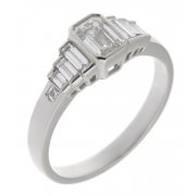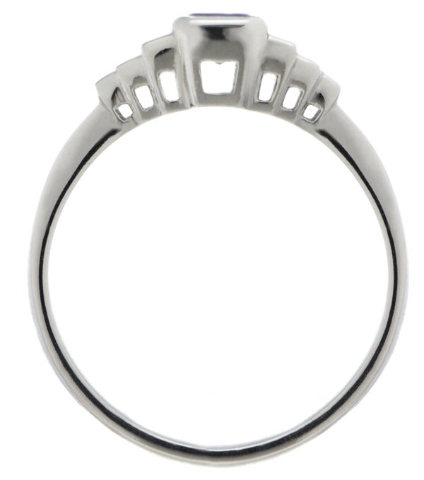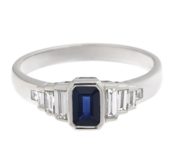 A 1920's art deco style ring with a rubbed over set emerald cut, octagon blue sapphire centre stone with stepped, graduated baguette cut diamonds.