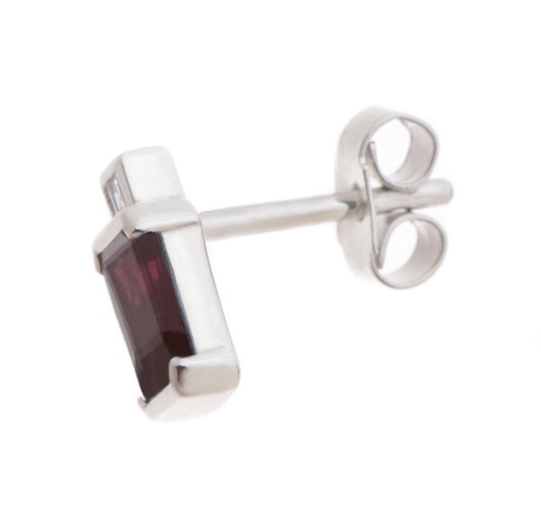 Art deco designer style drop earrings with a contemporary semi rubover or rubbed over set emerald cut rubies and square baguette cut diamonds.