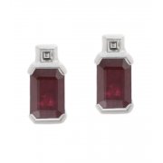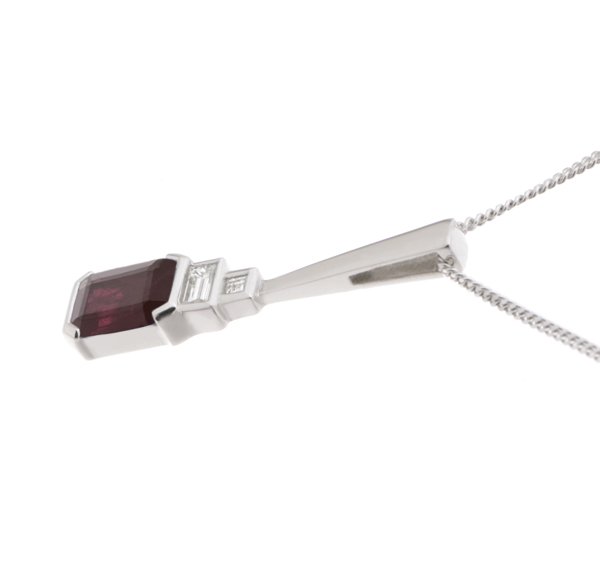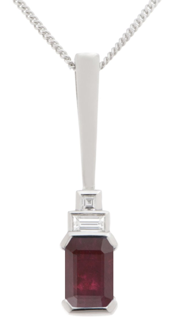 Art deco designer style drop pendant with a contemporary semi rubover or rubbed over set emerald cut ruby and baguette cut diamonds.