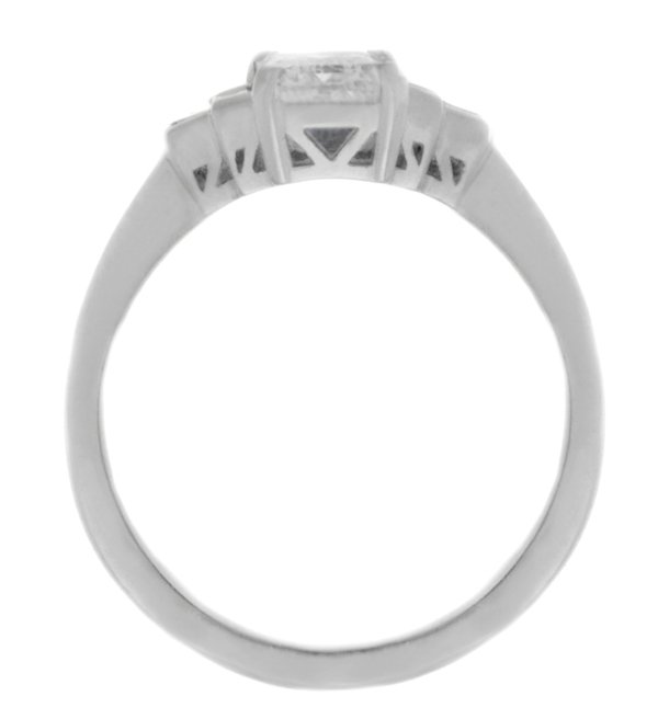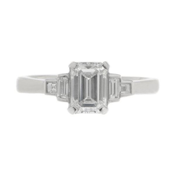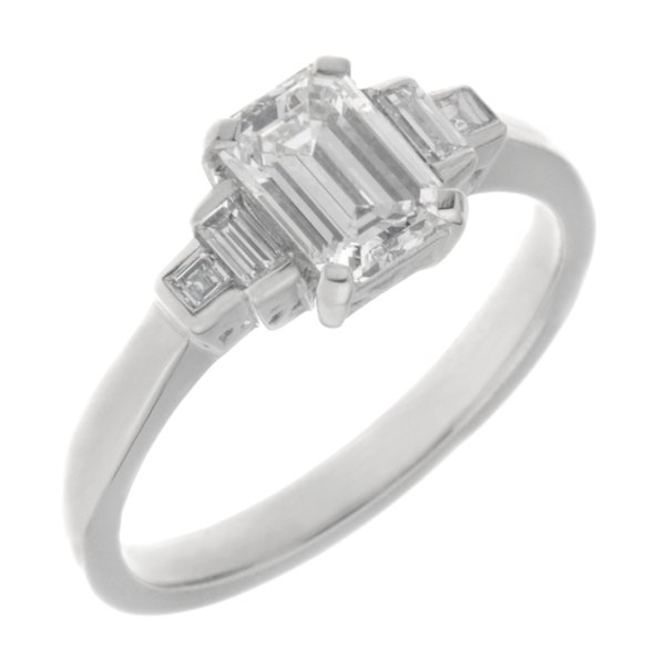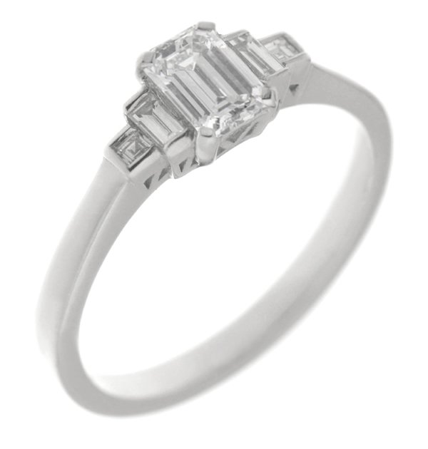 A classic art deco style with an emerald cut diamond centre stone with two stepped, graduated baguette cut diamonds set in to the shoulders and a detailed side setting.