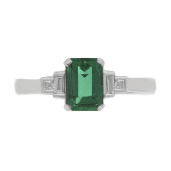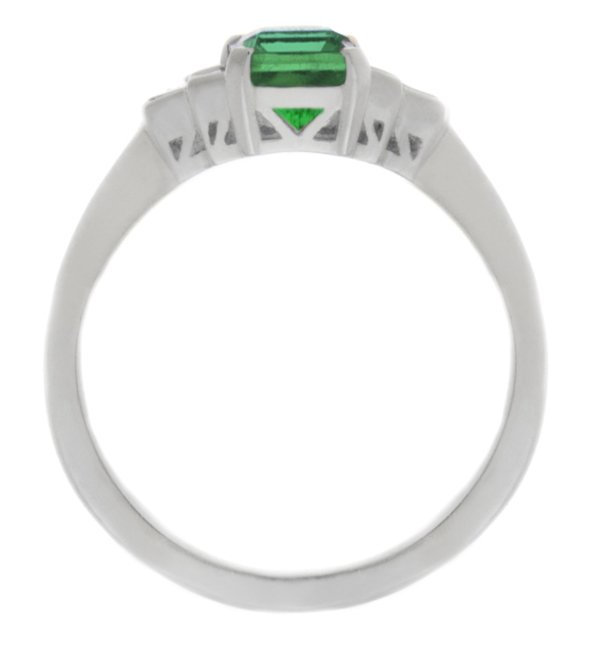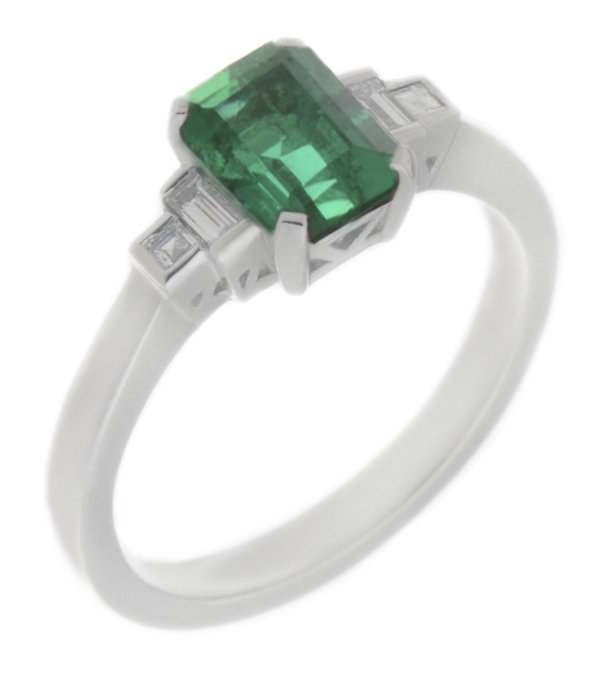 A classic art deco style ring with an emerald cut emerald centre stone with two stepped, graduated baguette cut diamonds set in to the shoulders and a detailed side setting.