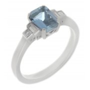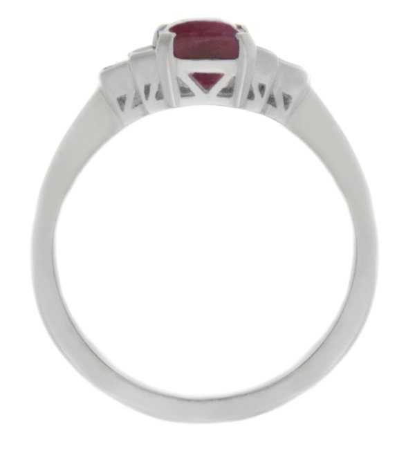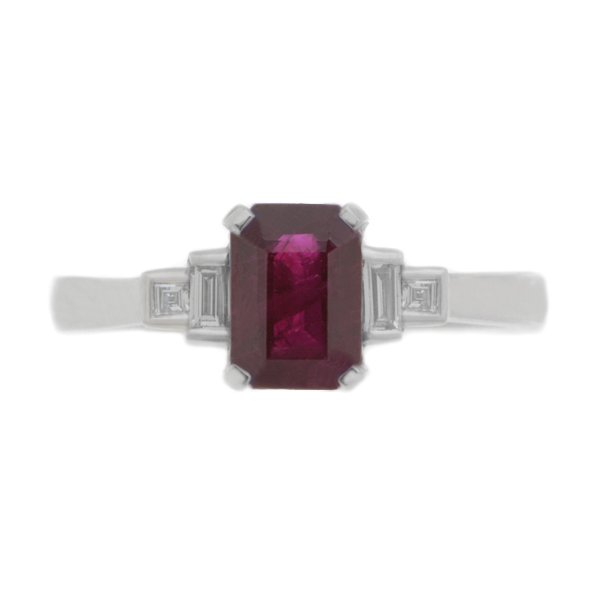 A classic art deco style ring with an emerald cut ruby centre stone with two stepped, graduated baguette cut diamonds set in to the shoulders and a detailed side setting.