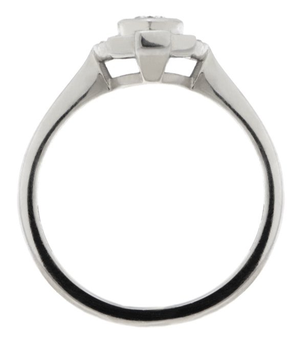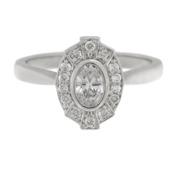 A vintage art deco style cluster ring with an oval shape diamond & halo of round brilliant cut diamonds set within a fan style 1920's design.
