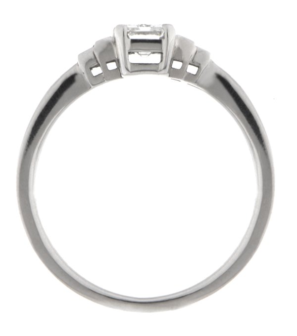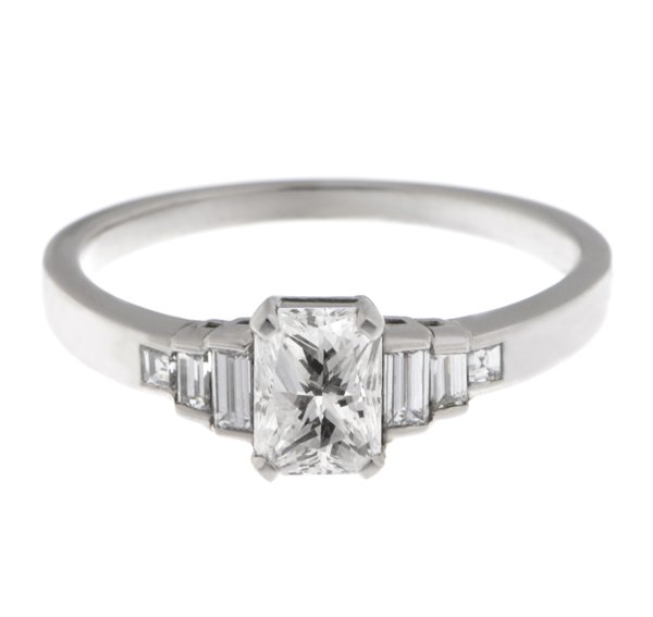 A classic 1920's art deco style engagement ring with a radiant cut diamond centre stone & stepped, graduated baguette cut diamonds.