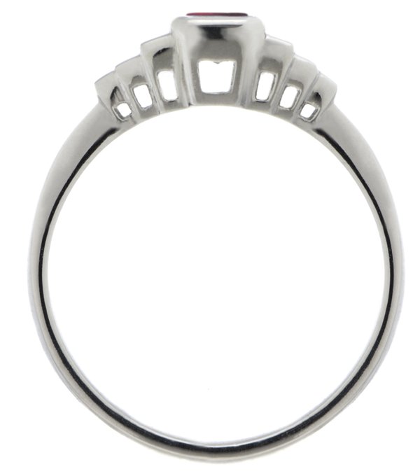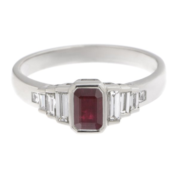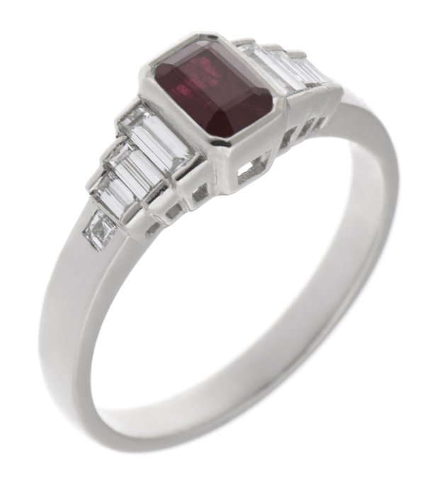 A 1920's art deco style ring with a rubbed over set emerald cut, octagon ruby centre stone with stepped, graduated baguette cut diamonds.