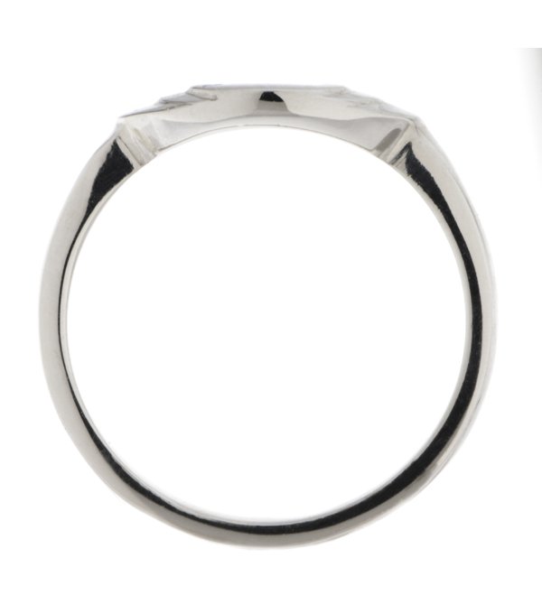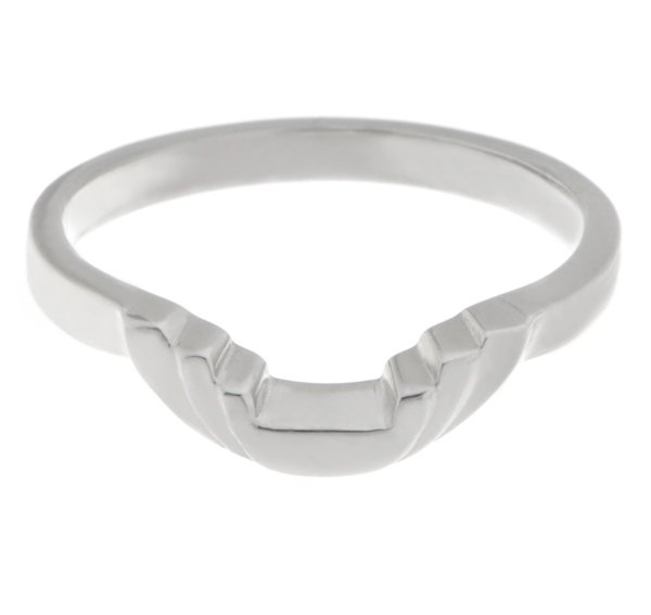 An art deco style shaped wedding band with a crescent shape to the outside of the steps. Designed to fit next to, around another ring.