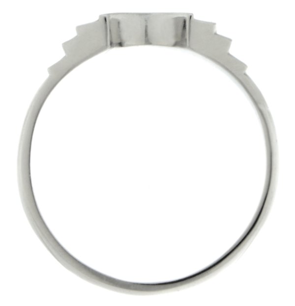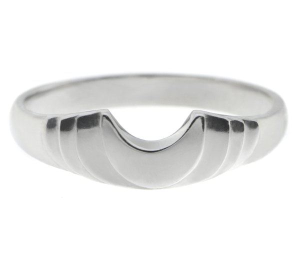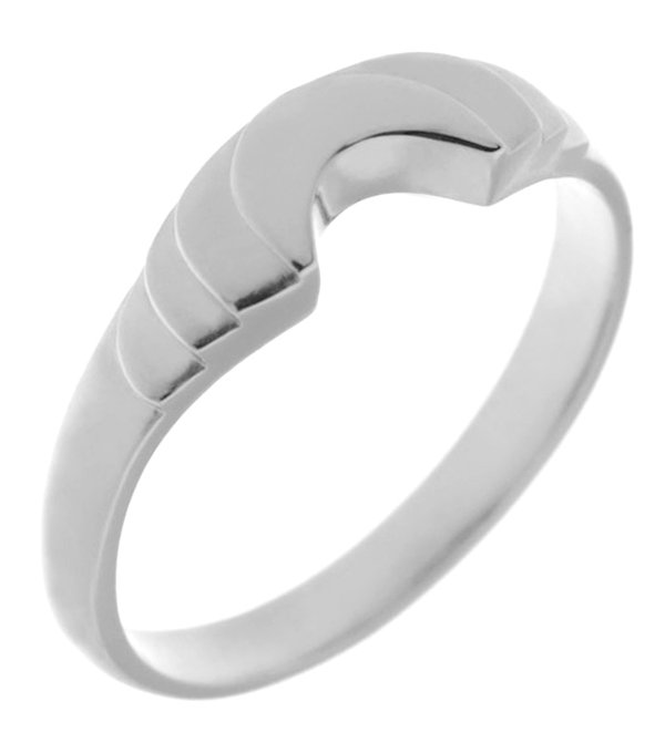 An art deco style ring with steps down to the shoulder and a deep crescent shape. Designed to fit next to or around an engagement ring.