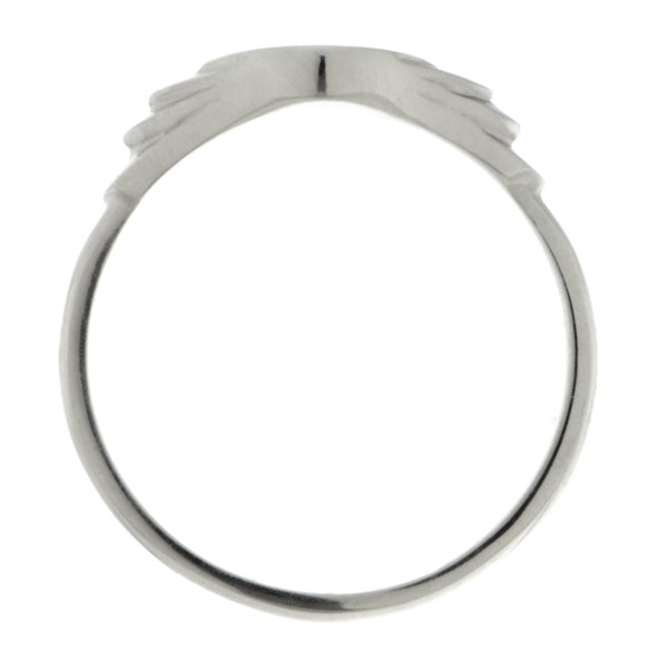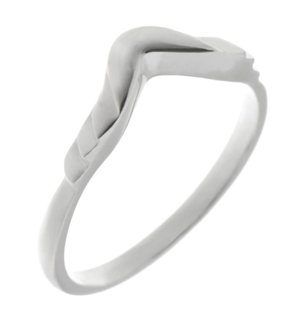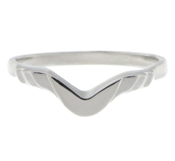 An elegant wishbone style ring with art deco style steps down to the shoulder.