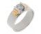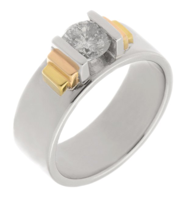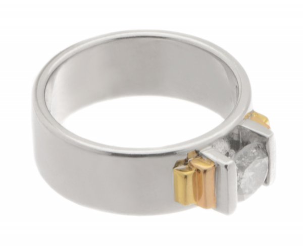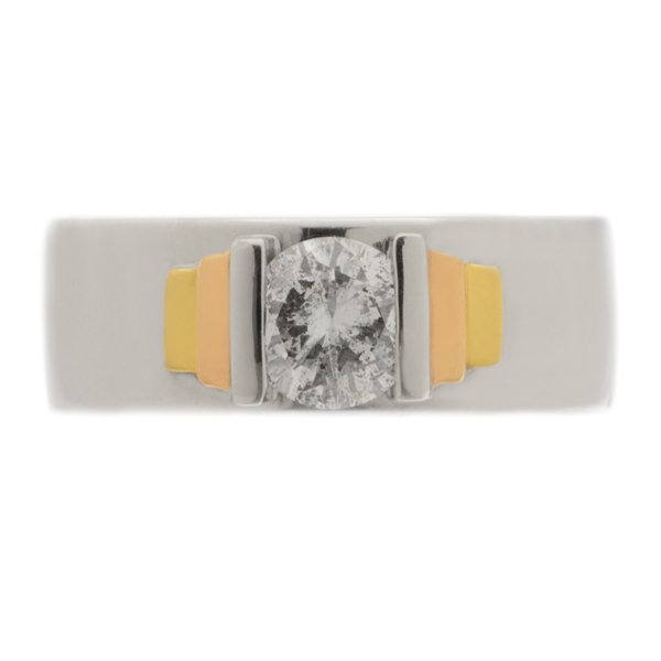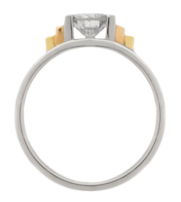 An art deco style round brilliant cut diamond solitaire ring with white, yellow and red gold step setting and an 8mm wide ring.