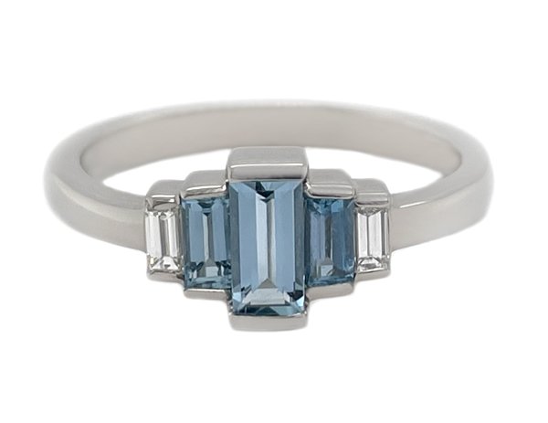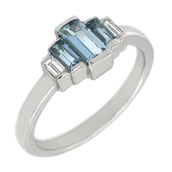 An Art deco style five stone cluster ring with a baguette cut centre Aquamarine (or Aqua) with 2x baguette cut side Aquas and 2x baguette cut diamonds.