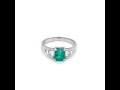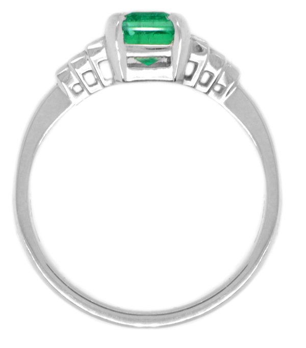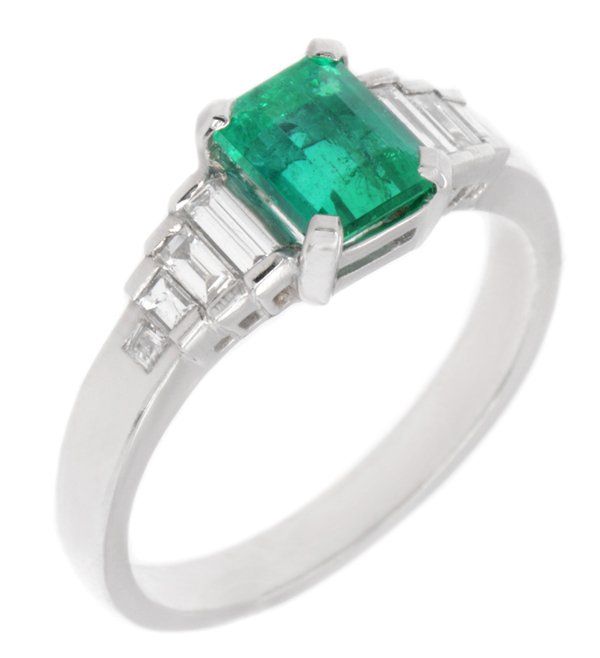 A 1920's art deco style ring with an emerald cut, octagon shaped emerald main stone and four baguette cut diamond stepped shoulders.