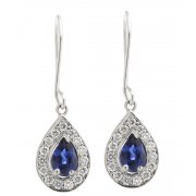 Classic art deco style drop earrings with a pear shape main diamond and a halo of round brilliant cut diamonds.