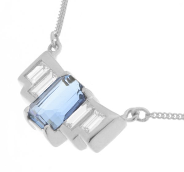 An art deco style cluster pendant with an angel wing design, an emerald cut aquamarine centre and baguette cut diamonds.