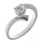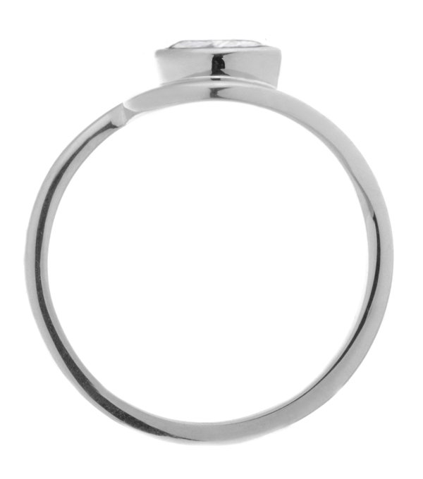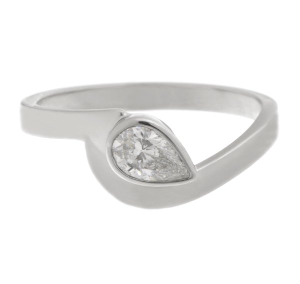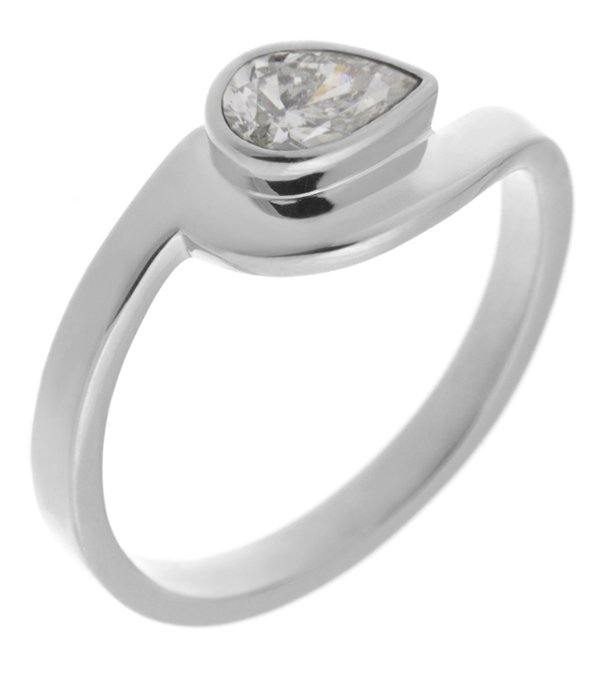 A pear shape diamond solitaire engagement ring with a modernist contemporary rubover setting & crossover design.