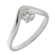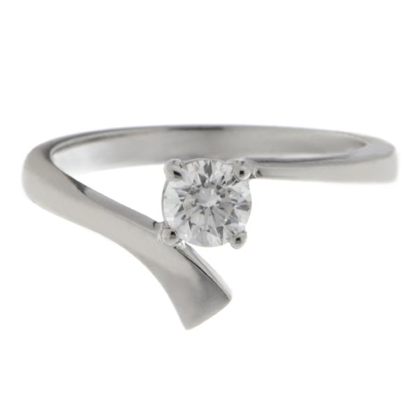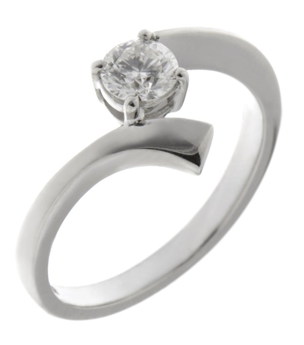 A modernist style solitaire round brilliant cut diamond ring with a 'kick out' design.