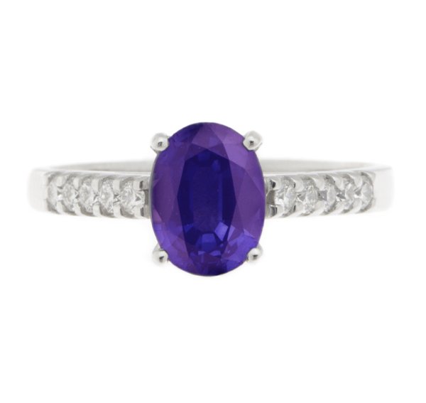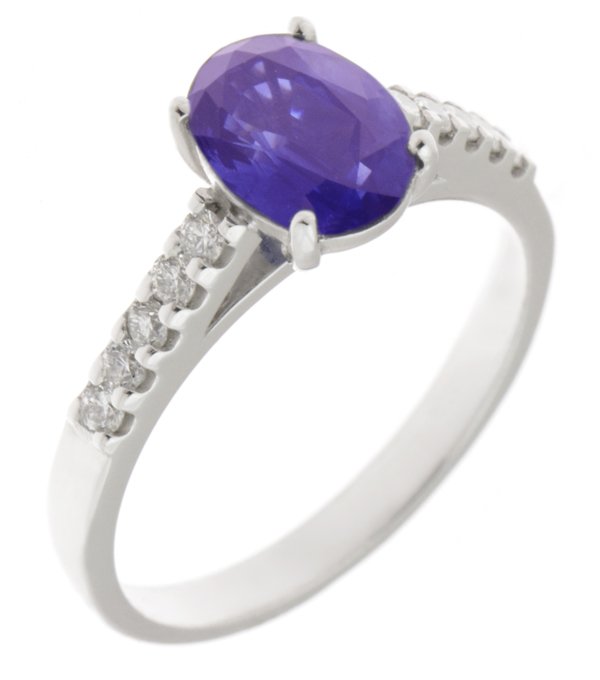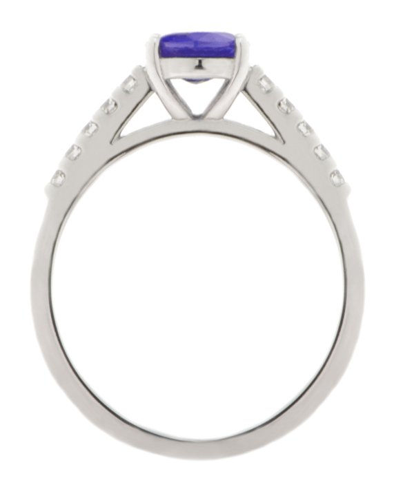 A classic oval tanzanite ring with four claws to the main centre stone and claw set round brilliant cut diamond set in to the shoulders or band.