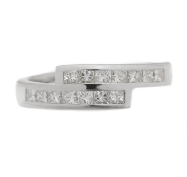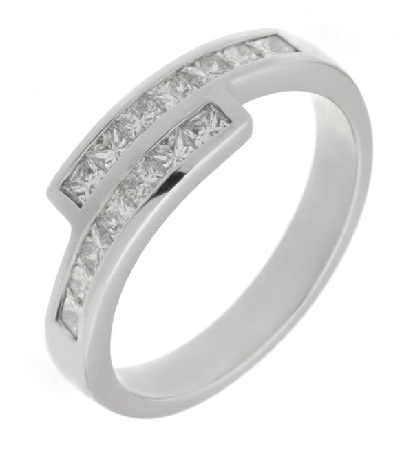 A modernist crossover style two row eternity ring with channel set princess cut diamonds.