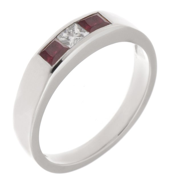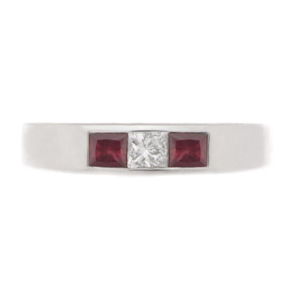 A modernist square cut ruby and princess cut centre diamond trilogy ring with a contemporary channel setting.