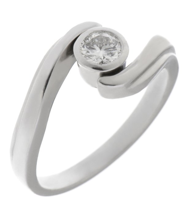 A classic crossover style solitaire round brilliant cut diamond engagement ring with an Art Deco style in the crossover design.