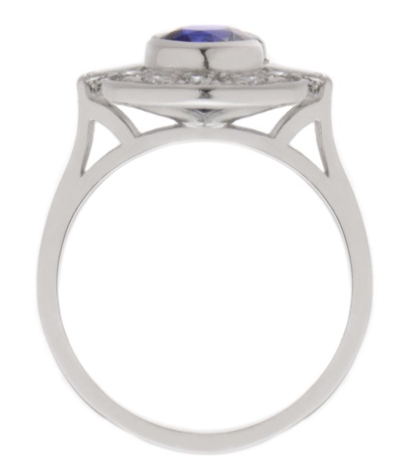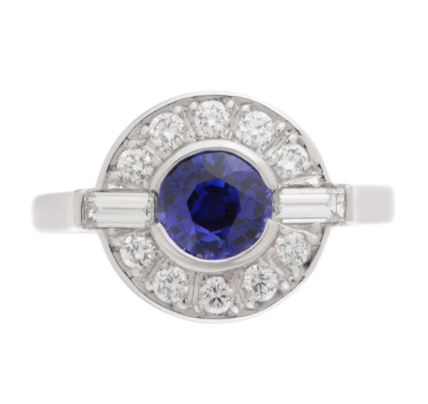 A classic 1920's, 1930's art deco cluster design ring with a semi rubover round blue sapphire, two accent baguette diamonds and a halo of grain set round diamonds.