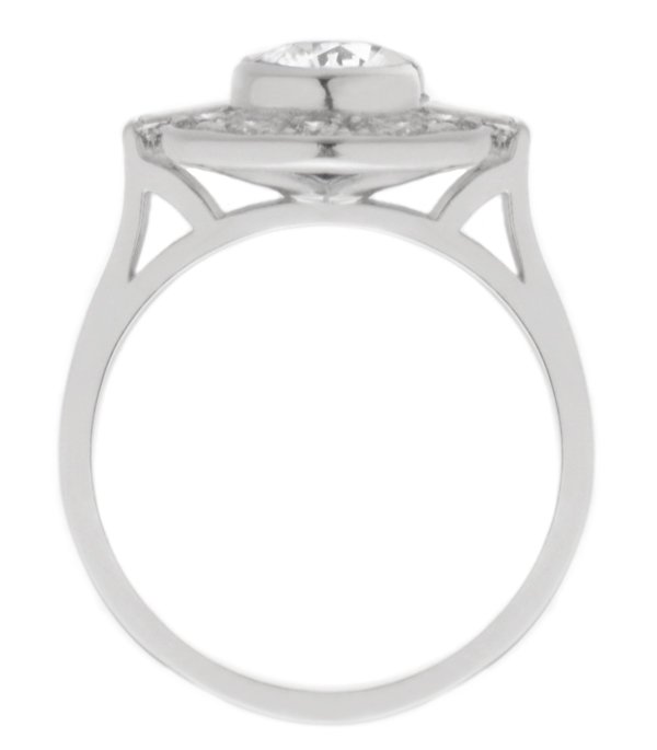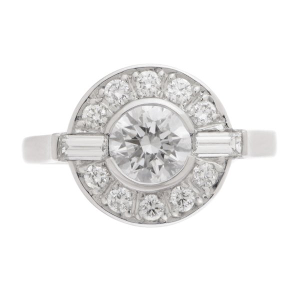 A classic 1920's, 1930's art deco cluster design ring with a semi rubover round diamond, two accent baguette diamonds and a halo of grain set round diamonds.