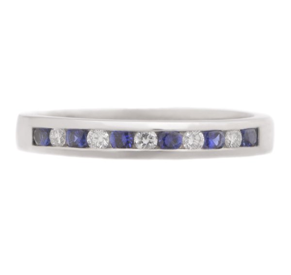 A classic channel set eternity ring with round brilliant cut diamonds and round blue sapphires.
