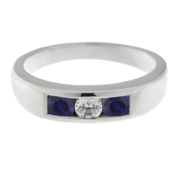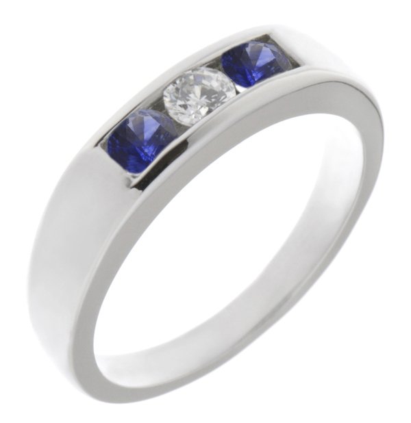 A classic channel set trilogy ring with a round brilliant cut diamond centre stone and two round blue sapphires in a modern, contemporary style.
