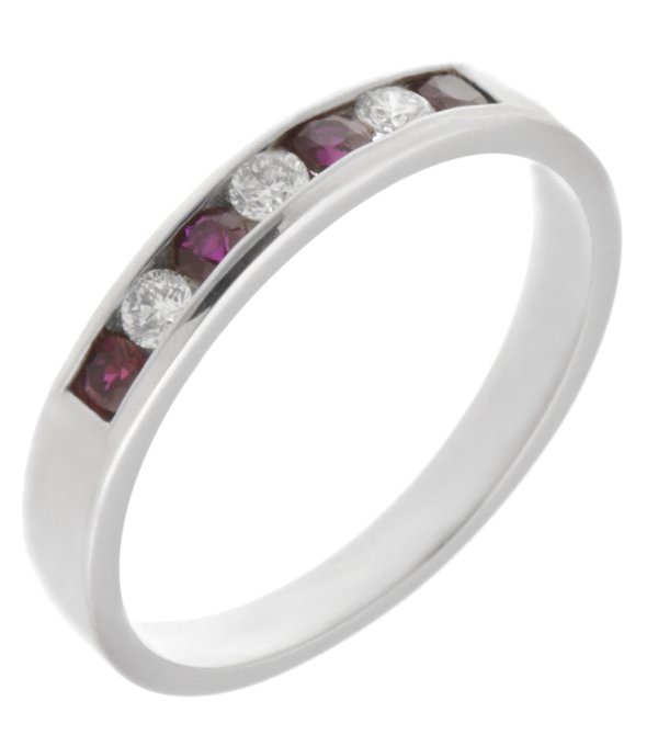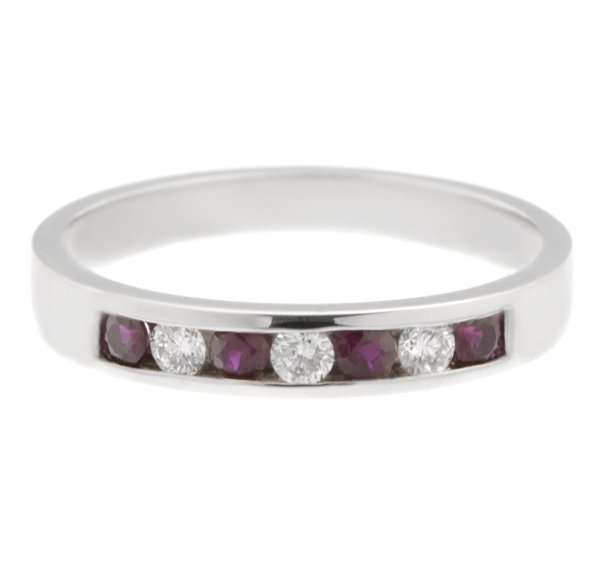 A classic channel set eternity ring with round brilliant cut diamonds and round rubies.