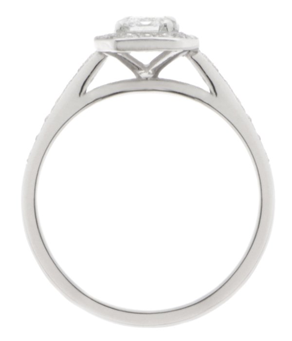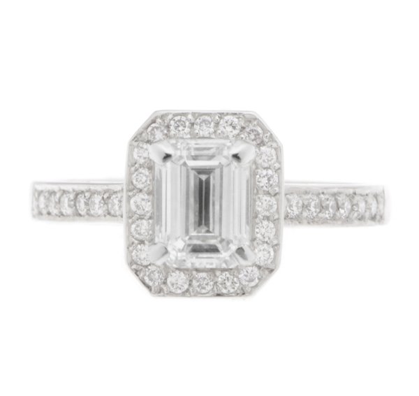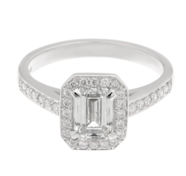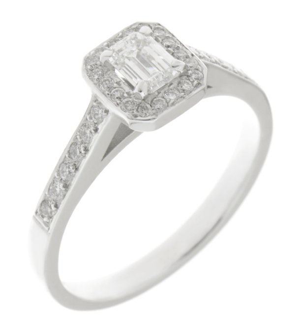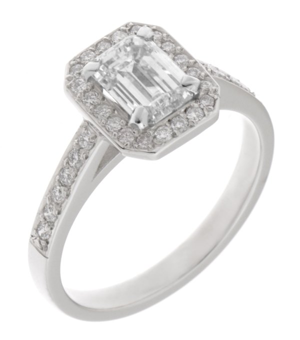A classic Art Deco style cluster ring with an emerald cut centre diamond with claw setting and grain set round brilliant cut diamonds set in to the shoulders and halo surround.