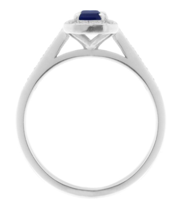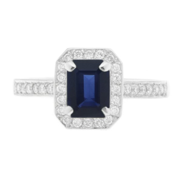 A classic Art Deco style cluster ring with an emerald cut centre blue sapphire with claw setting and grain set round brilliant cut diamonds set in to the shoulders and halo surround.