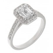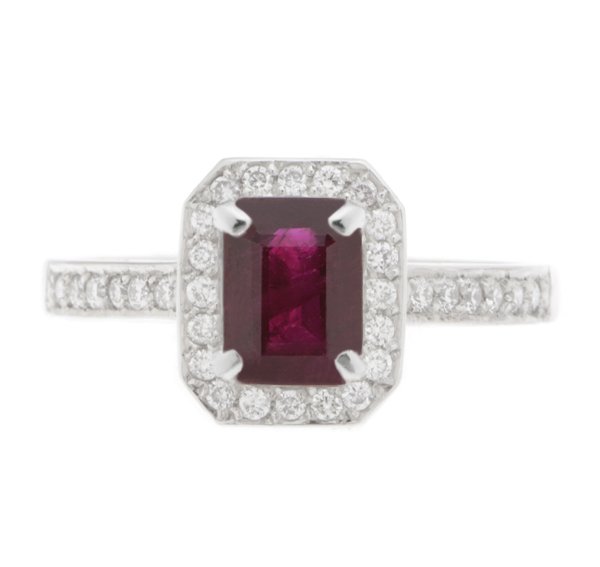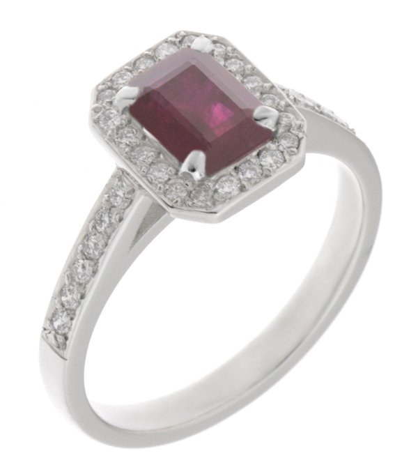 A classic Art Deco style cluster ring with an emerald cut centre ruby with claw setting and grain set round brilliant cut diamonds set in to the shoulders and halo surround.