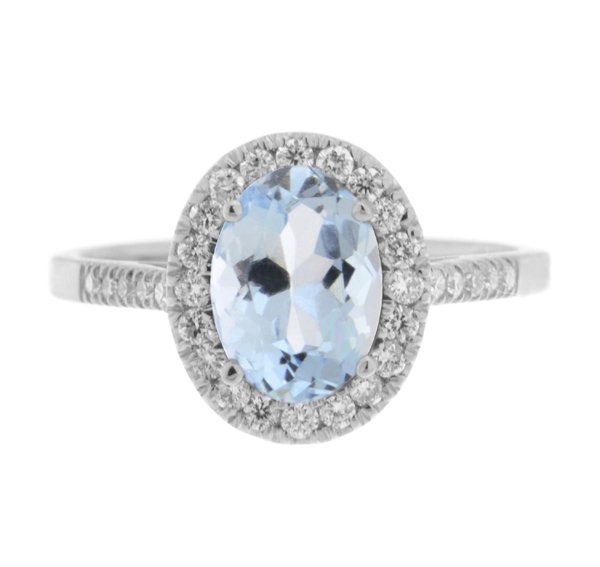An elegant vintage style oval aquamarine halo cluster ring with claw set surround and shoulder round brilliant cut diamonds.