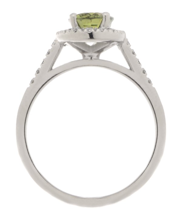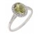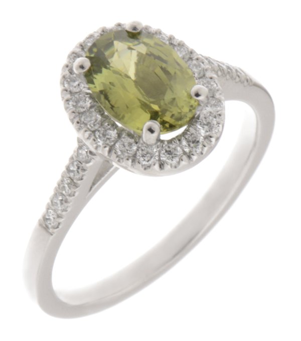 An elegant vintage style oval green sapphire halo cluster ring with claw set surround and shoulder round brilliant cut diamonds.