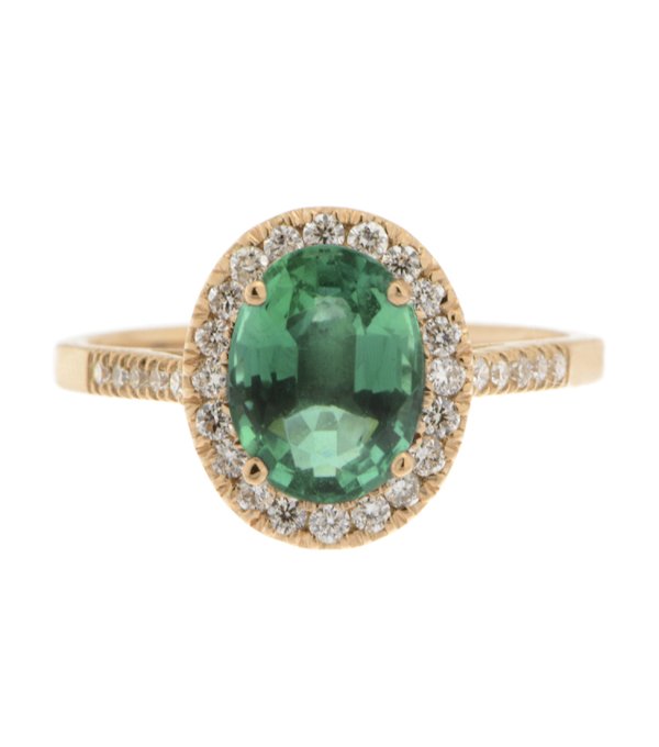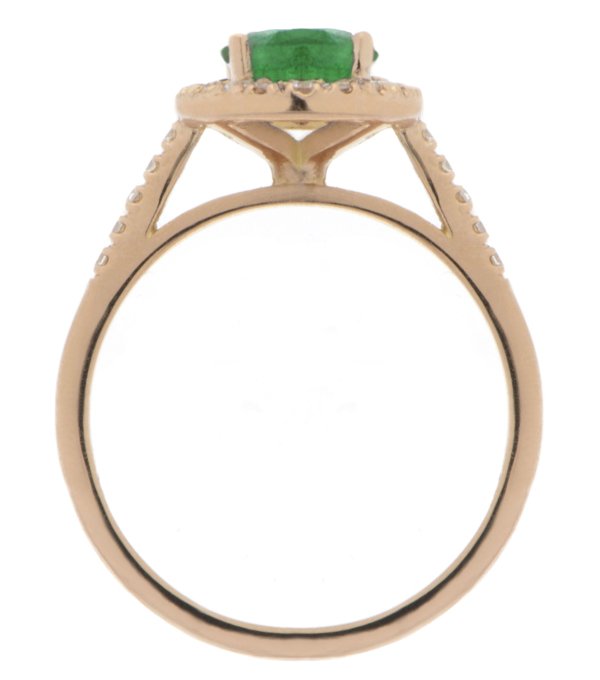 An elegant vintage style oval emerald halo cluster ring with claw set surround and shoulder round brilliant cut diamonds.