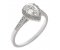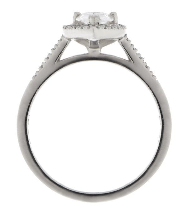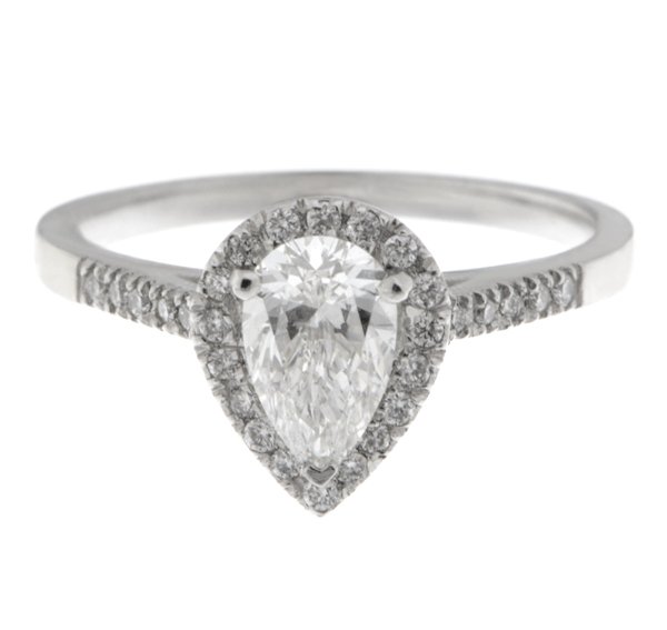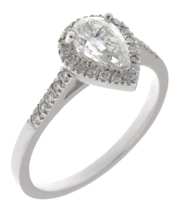 An elegant vintage style classic pear shape diamond halo cluster ring with grain set surround and shoulder round brilliant cut diamonds.