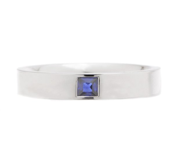 A flat court shaped wedding band with a flush set square cut blue sapphire.
