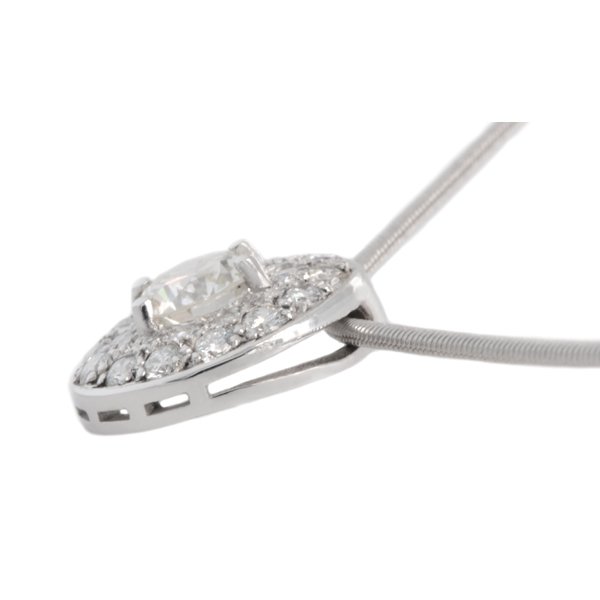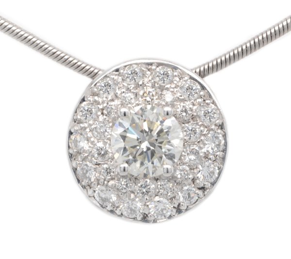 This round brilliant cut diamond cluster pendant has a 0.82ct (approximately 6mm) J colour, VS2 clarity independently certificated central main diamond and 0.53ct of smaller grain set round brilliant cut diamonds in the cluster surround.