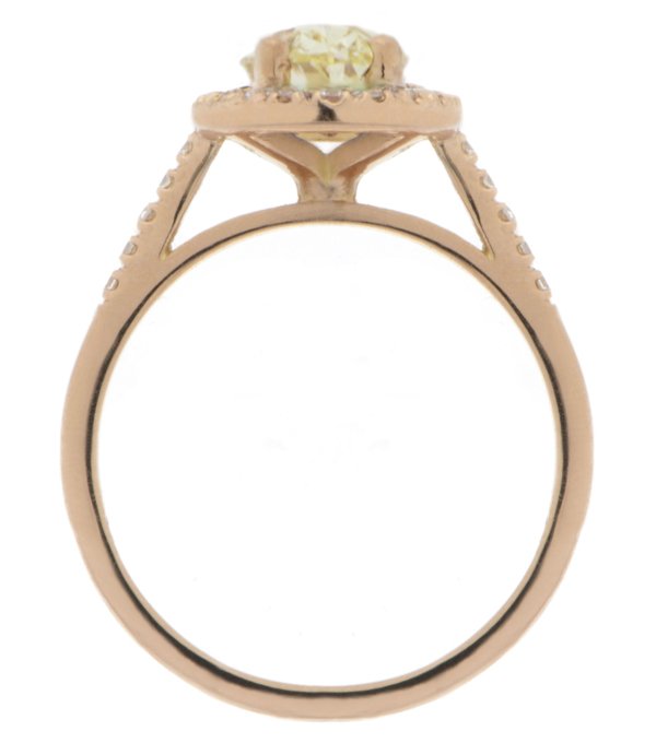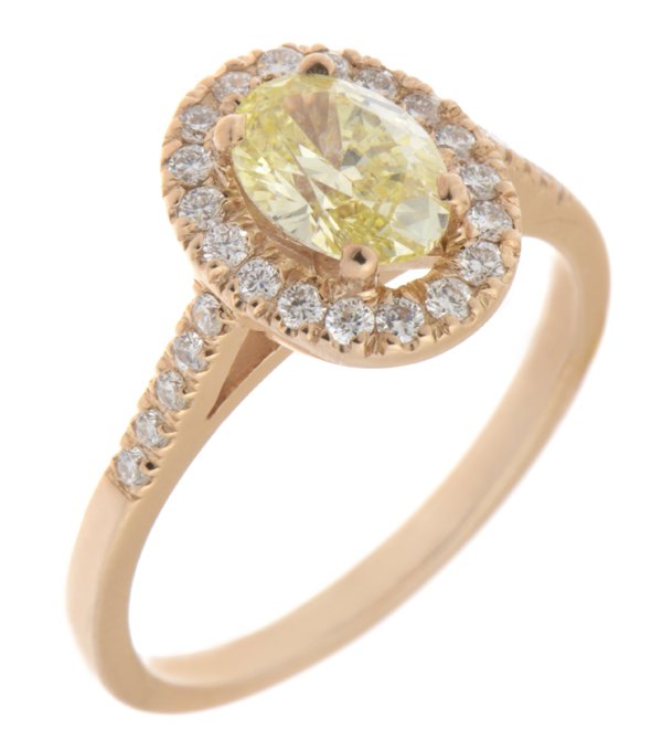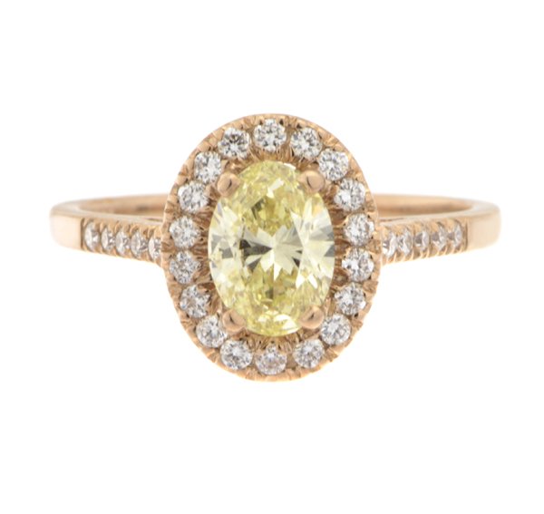 An elegant vintage style halo cluster ring with a natural oval fancy yellow diamond that weighs 0.74ct, with approximate measurements of 7.06mm x 5.10mm, an SI1 clarity grade and a GIA certificate. It has a halo and shoulders of claw set round brilliant cut diamonds.