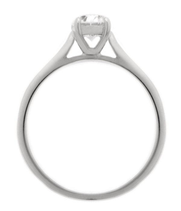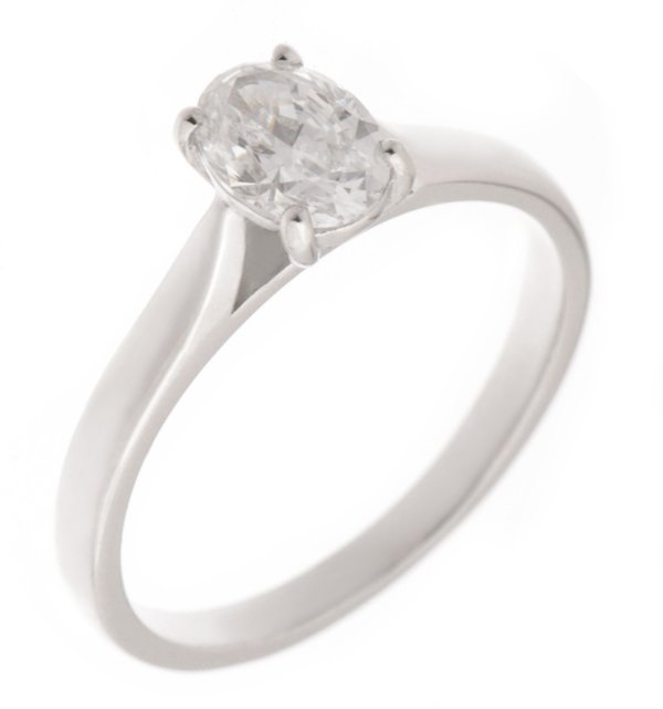 A classic engagement ring with a solitaire oval cut diamond, court shape shoulders and a four claw setting.