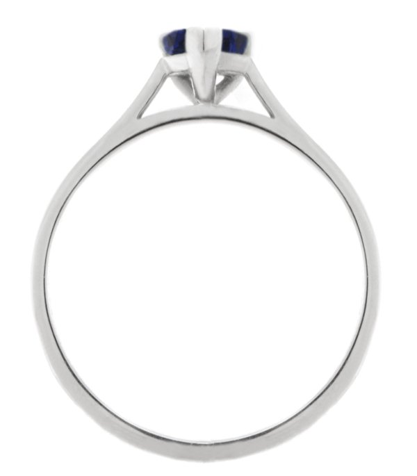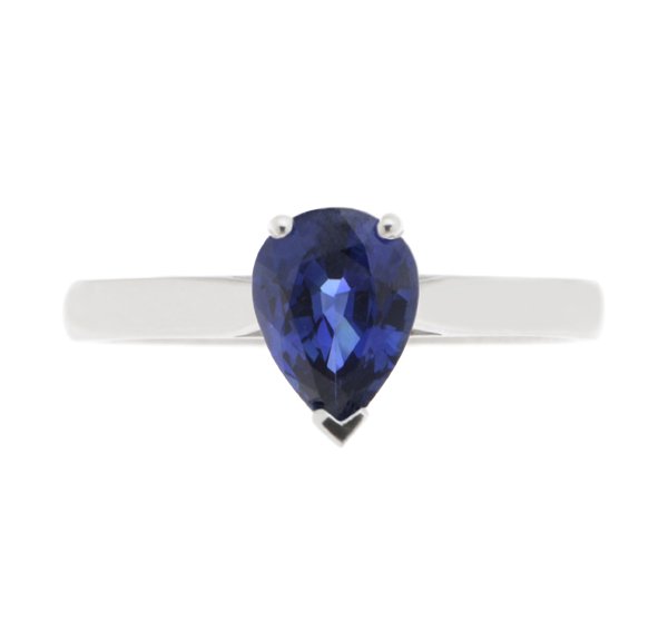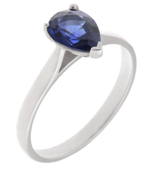 A classic solitaire ring with a pear cut blue sapphire, tapered shoulders and claw setting.