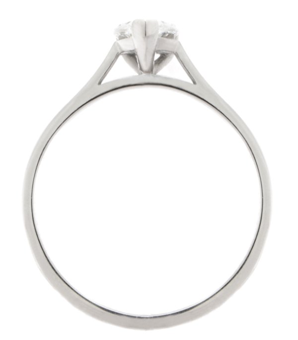 A classic solitaire engagement ring with a pear cut diamond, tapered shoulders and claw setting.