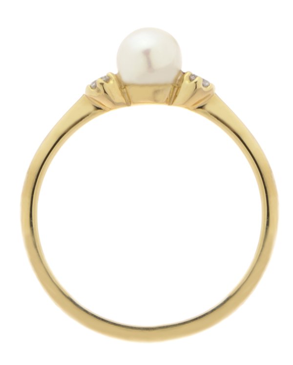 A classic vintage style trilogy ring design with a round freshwater cultured pearl in the centre and two round brilliant cut diamonds set with six claws.