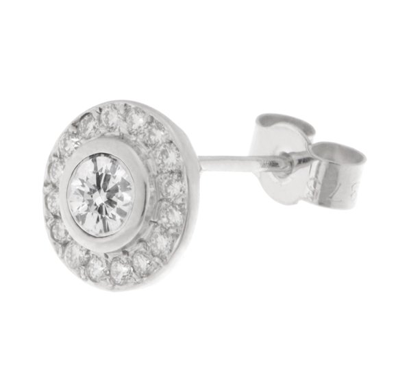 This is a timeless design, cluster style earrings with a rubover set central round brilliant cut diamond with a halo of grain set round diamonds.