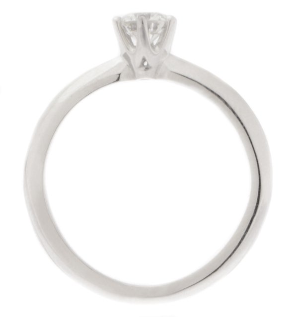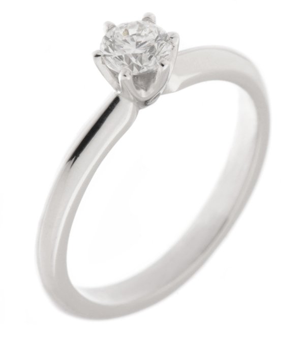 An elegant six claw solitaire round brilliant cut diamond engagement ring.
