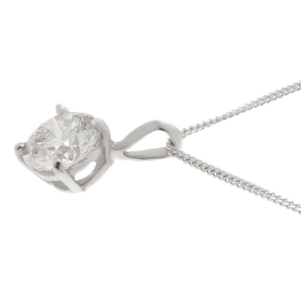 A classic four claw solitaire round brilliant cut diamond pendant with a single bail style chain loop.